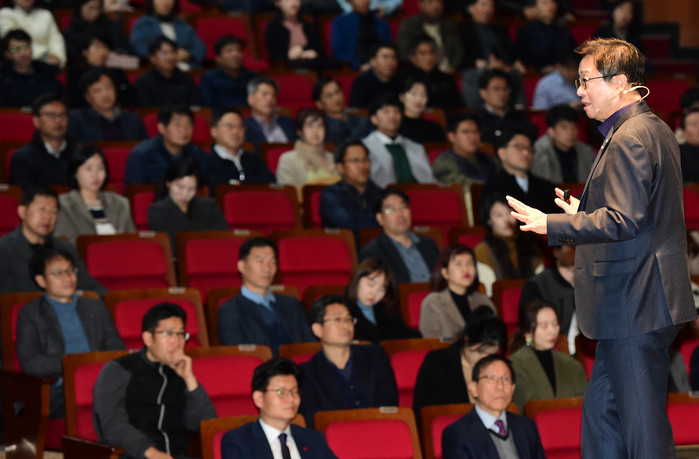 | ▲염태영 시장이 공주시민과 공직자를 대상으로 강연을 하고 있다.(수원시 제공) |