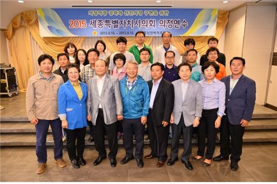 ▲세종시의원들이 하반기 의정연수에서 기념촬영을 하고 있다. |