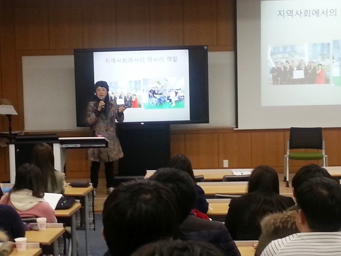 [로컬세계 조윤찬 기자]충남대학교 약학과 출신이며 현재 충남대학교 약학과 총동문회 부회장으로 활약중인 대전시의회 구미경 의원(새민련 비례대표)이 23일 오후 5시 충남대학교 약학대학 약학과 신입생 오리엔테이션(OT)에서 특강을 했다.