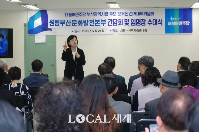 [로컬세계 맹화찬 기자]지난 21일 더불어민주당 오거돈 부산광역시장 후보 서면 선거캠프에서 '원팀부산문화발전본부 간담회 및 임명장 수여식'을 가졌다.