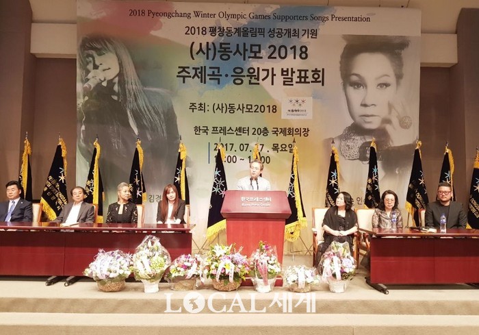 ▲원호경 (사)동사모2018 이사장이 지난 27일 한국프레스센터 국제회의장에서 '2018 평창동계올림픽 성공적인 개최를 위한 주제곡.응원가 음반 발표회를 갖고 인사말을 하고 있다. 문기표 기자. |