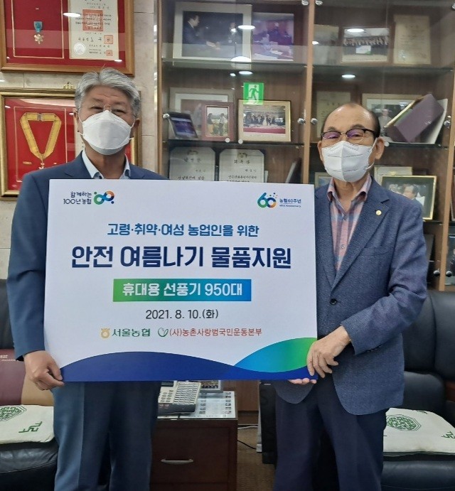 농협중앙회 서울지역본부(본부장 이대엽)와 (사)농촌사랑범국민운동본부는 농협 창립 60주년을 맞아 폭염피해 예방을 위해 10일 고령·취약·여성 농업인에게 '안전여름나기 물품'인 휴대용 선풍기 950개를 전달했다고 밝혔다.