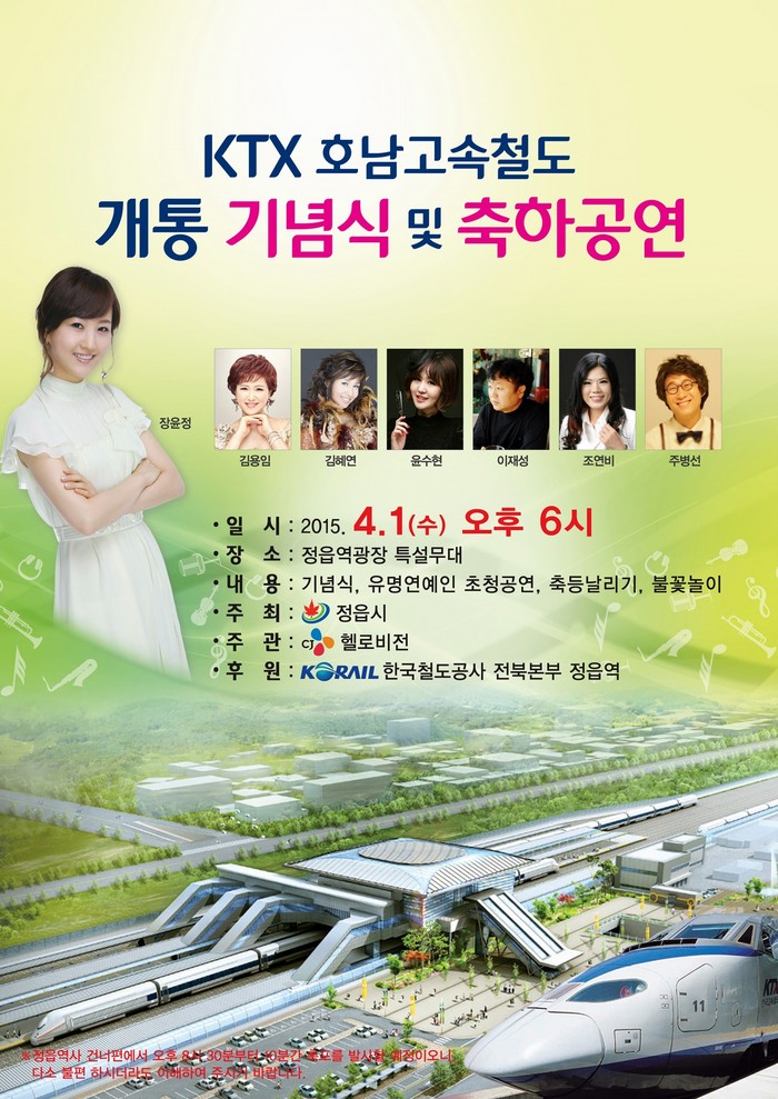[로컬세계 김경락 기자] 전북 정읍시는 4월 2일 KTX 호남고속철도가 개통됨에 따라 이를 기념하고 축하하기 위해 4월 1일 저녁 6시부터 정읍역광장 특설무대에서 ‘KTX 호남고속철도 개통 기념식 및 축하공연’을 개최한다.