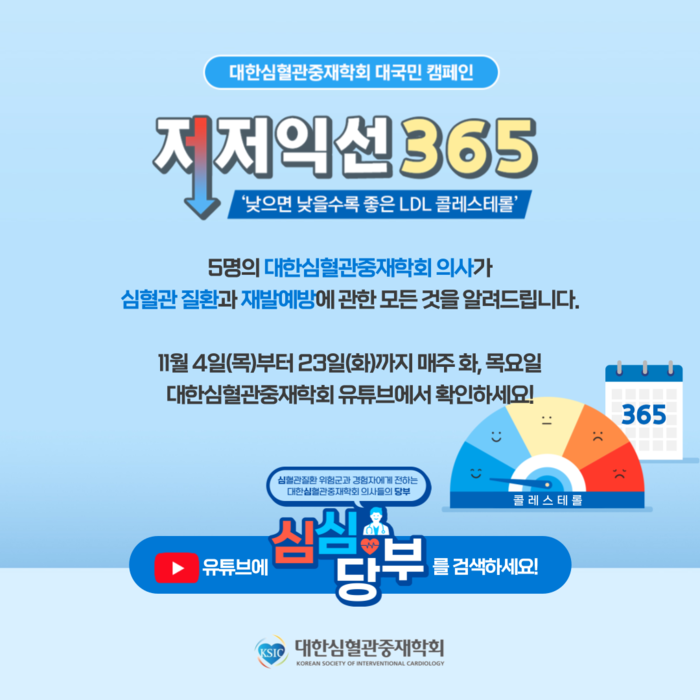대한심혈관중재학회(이사장 채인호)는 심혈관질환 환자들의 LDL 콜레스테롤 관리 중요성을 전하기 위해 ‘나쁜 콜레스레롤 낮으면 낮을수록 좋은 저저익선(低低益善) 365’ 캠페인을 11월부터 12월까지 진행한다고 4일 밝혔다.