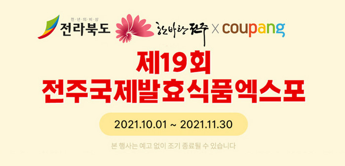 쿠팡은 전북바이오융합진흥원과 전라북도 내 식품기업의 우수한 상품을 로켓배송으로 선보이는 ‘전주국제 발효식품 엑스포 기획전’을 진행한다고 18일 밝혔다.