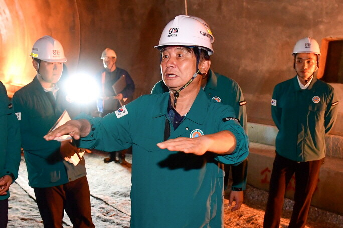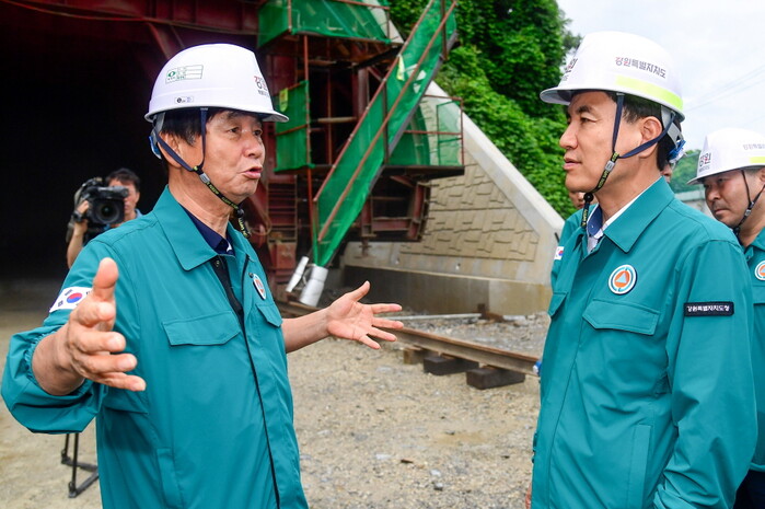 최문순 군수와 김진태 강원특별자치도지사는 17일 집중호우에 대비해 지방도 461(구만~오음) 공사 현장을 방문하여 시설물 등을 점검했다.(사진=화천군 제공)