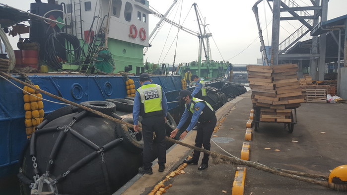 ▲기상악화에 대비하여 해양경찰관이 남항 선박계류상태 및 계류시설을 점검하고 있다. |