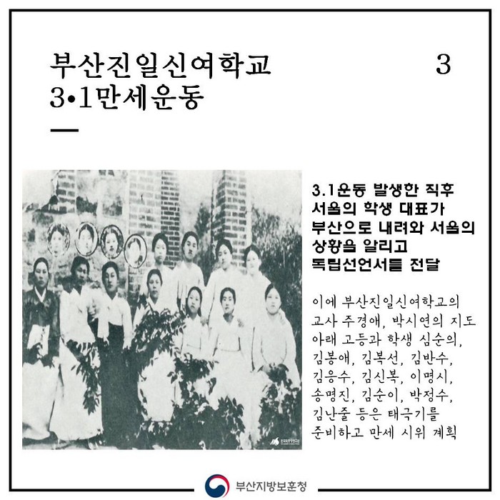 부산보훈청은 카드뉴스를 통해서 일신여학교의 시작과 3.1만세운동, 오는 28일에 있을 재현행사까지 간략하게 소개하고 시민들의 관심을 유도하기 위해 이번 이벤트를 기획했다.