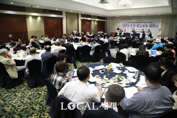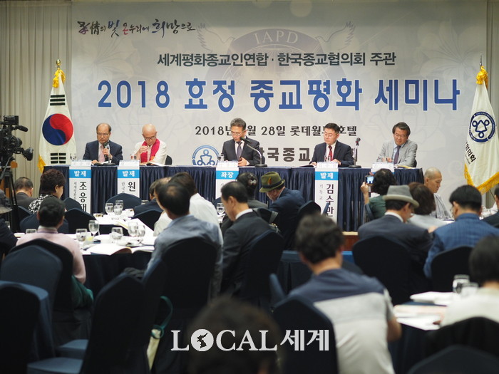 [로컬세계 고기훈 기자/이건용·조소이·김연경·김연주 인턴기자]종교인들이 한반도 통일을 위해 한 자리에 모였다. (사)한국종교협의회와 세계평화종교인연합(IAPD) 공동주최로 28일 서울 롯데호텔잠실점에서 '2018 효정 종교평화 세미나'가 개최됐다.