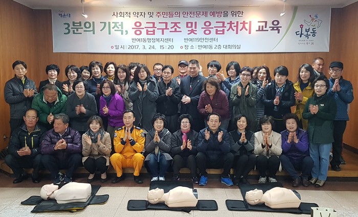 이날 교육에는 반여1동 복지위원 42명이 참석해 심폐소생술 기본이론과 실습, 자동제세동기 사용방법 등을 배웠다.