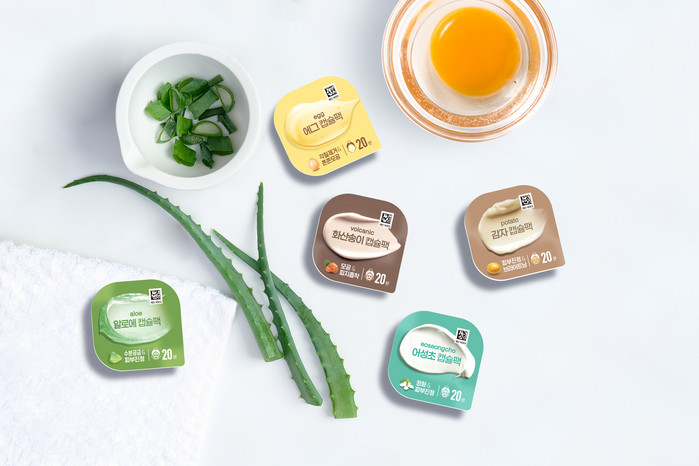 마스크 팩은 편리성이 눈에 띈다. ‘미니캡슐팩’ 은 한 손에 들어오는 작은 사이즈 1회 분량으로 ‘알로에, 어성초, 감자, 화산송이, 에그’ 총 5종류를 따로 구매할 수 있다. 피부 상태에 따라서 종류를 선택하면 되고 크기가 작아 어디에서나 간편한게 사용할 수 있다.
