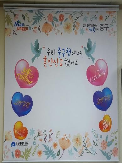 구는 디지털시대인 요즘 신혼부부들이 혼인신고 후 기념사진을 찍어 SNS에 올리는 경우가 많은 점을 착안해 “우리 중구청에서 혼인신고 했어요”라는 문구를 삽입한 포토존을 조성했다.