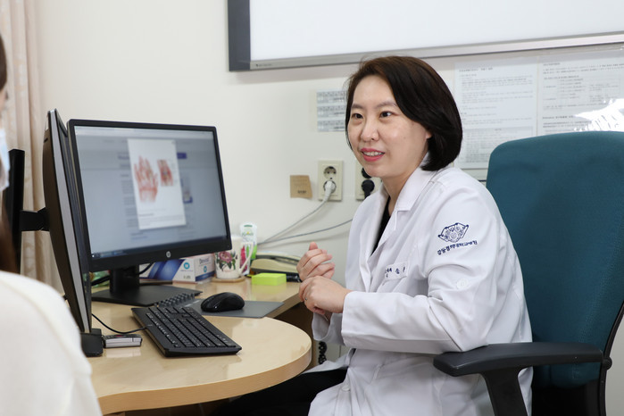 ▲강동경희대학교병원 류마티스내과 송란 교수가 한 환자와 진료상담하고 있다. |