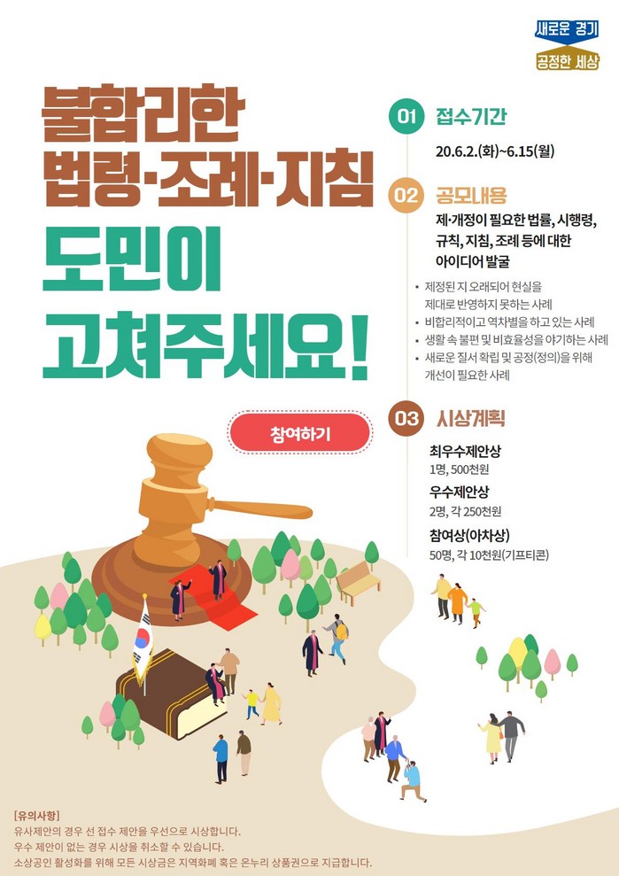 참여방법은 경기도의소리에서 진행되고 있는 ‘불합리한 법령 조례 지침, 도민이 고쳐주세요’를 통해 참여하면 된다.