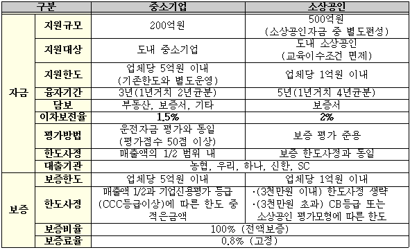 소상공인 업체당 최대 1억원, 이차보전율 2% 지원, 1년거치 4년 균분 상환