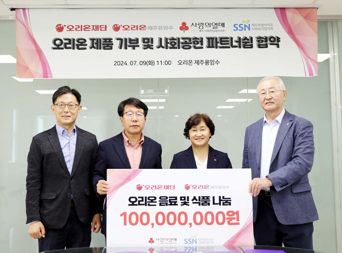오리온 그룹은 지난 8일 사회공헌 기금 1억 3천만 원과 ‘닥터유 제주용암수’, ‘초코파이情’ 등 1억 원 상당의 제품을 제주사회복지공동모금회에 기탁했다. 기탁금은 구좌읍, 조천읍, 표선읍 지역 아동, 노인, 이주여성 등 주민 복지를 위해 사용되며, 제품은 제주특별자치도사회복지협의회가 운영하는 푸드뱅크를 통해 도내 사회복지시설과 취약계층 가정에 전달할 계획이다.