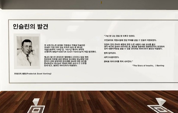 총 4개의 가상현실(VR)의 전시관에서 선사시대부터 등장한 당뇨병의 역사와 인슐린 개발에 힘쓴 여러 과학자들의 이야기를 직접 박물관에 있는 것처럼 관람할 수 있다. 이외에도 대한당뇨병학회의 역사 및 활동과 함께 인슐린의 종류와 보관방법 등 올바른 인슐린 교육 정보도 사진 및 동영상을 통해 제공하고 있다.