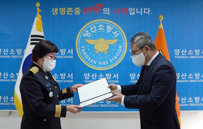 | ▲경남 양산시 양산소방서에서 열린 제59주년 소방의 날 기념식에서 쿠팡 양산물류센터 이윤우 센터장(사진 오른쪽)이 양산소방서 박정미 소방서장(사진 왼쪽)으로부터 경남도지사 표창을 받고 있다. [쿠팡 제공] |