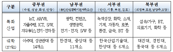 도는 현재 중부(IoT, AR/VE, 자율주행, ICT 등), 남부(광학, 콘텐츠, 생명공학, 전기·전자 등), 서부(녹색성장, 화학, 소재, 기계, 자동차 등), 북부(섬유, 가구, 의료기기 등) 총 4개 권역으로 나눠 특화산업을 육성하고 있다.