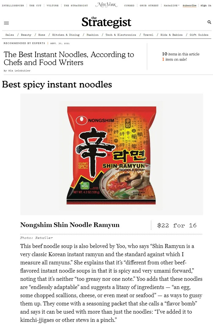 | ▲뉴욕매거진에서 운영하는 웹사이트 더 스트래티지스트(The Strategist)에 실린 농심 신라면 기사 |