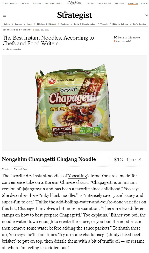 지난달 30일, 뉴욕매거진에서 운영하는 웹사이트 더 스트래티지스트(The Strategist)는 “셰프와 푸드라이터가 말하는 최고의 라면(The Best Instant Noodles, According to Chefs and Food Writers)”이라는 기사를 게재했다.