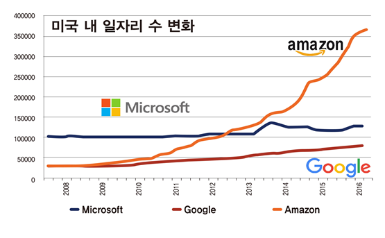 그는 특히 “시애틀에 본사가 있는 아마존은 최근 35만여개의 일자리를 창출했으며, 2016년 한 해에만 11만개가 증가해 마이크로소프트(시애틀에 본사 위치), 구글 등과 비교했을 때 급격한 고용창출이 있었다”고 했다(그림 1 참조).