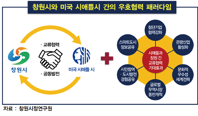 특히 정 위원은 창원시와 미국 시애틀시 간의 우호협력 패러다임을 제시해 주목을 받았다(그림참조). 정위원은 창원시.시애틀시 간의 교류협력으로 ▲첨단기업 협력강화 ▲관광산업 활성화 ▲문화적 우수성 세계전파 ▲글로벌 무역시장 동반개척 ▲시민참여·도시발전 경험공유 ▲스마트도시 정보공유 등의 6대 기대효과가 발생할 것으로 내다봤다.