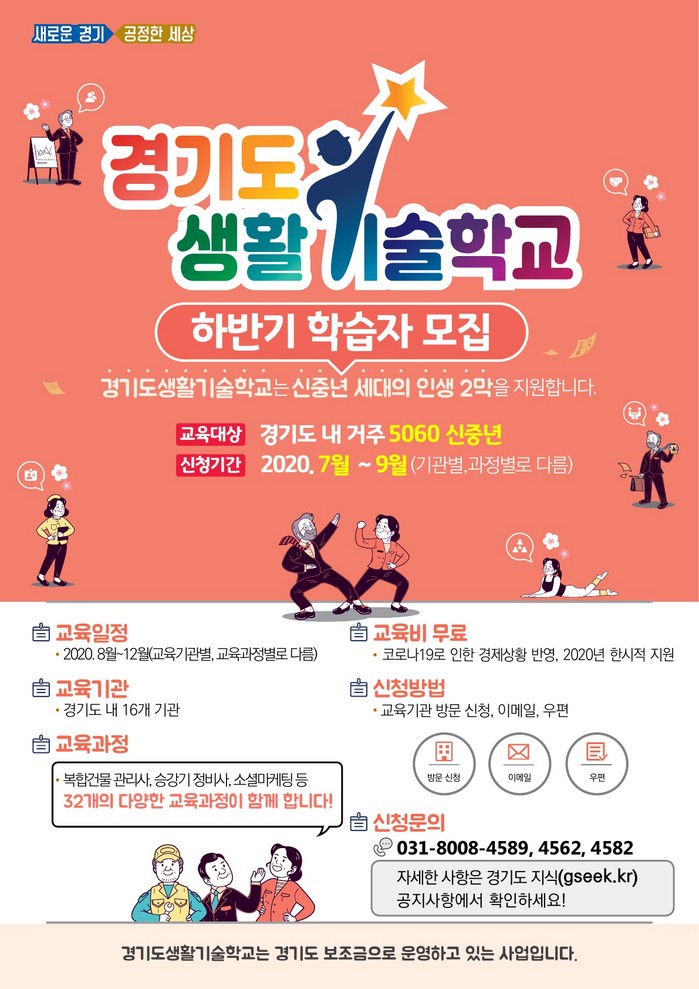 [로컬세계 고기훈 기자]경기도가 도내 5060 신중년 세대의 안정적 노후 준비를 위해 생활기술교육을 지원하는 ‘경기도생활기술학교’ 하반기 학습자를 모집한다.