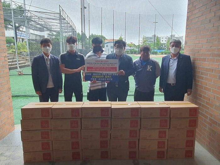 ▲지난 24일 태권브이건축사사무소가 이번 챌린지 통해 구입한 군산짬뽕라면 30박스를 군산상고 야구부에 전달했다. 원예농협 제공 |