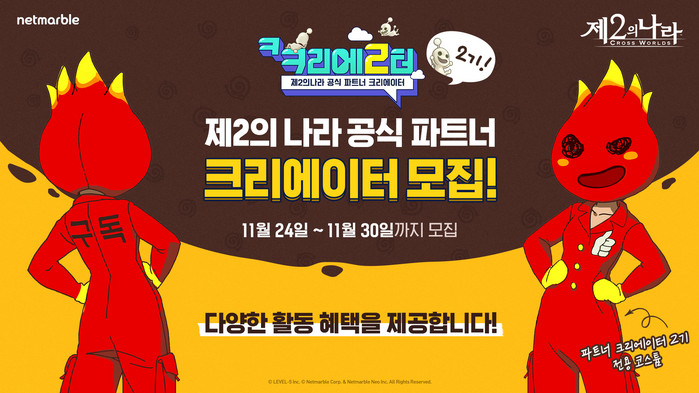 넷마블(대표 권영식, 이승원)은 감성 모험 RPG '제2의 나라: Cross Worlds'(이하 제2의 나라, 개발사 넷마블네오) 파트너 크리에이터 2기를 모집한다고 24일 밝혔다.