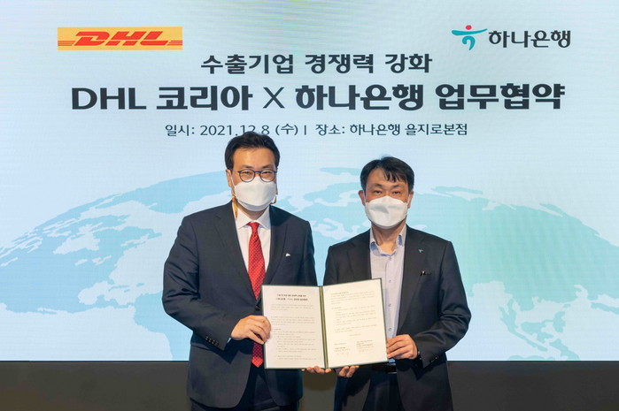 세계적인 국제특송기업 DHL코리아(대표 한병구)가 지난 8일 서울 중구 소재 하나은행 본점에서 국내 수출기업의 해외 물류 경쟁력 강화를 위해 하나은행과 업무협약(MOU)를 체결했다고 밝혔다.