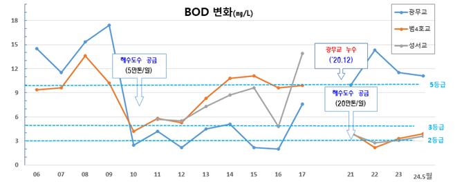그동안 해수도수 관로의 누수로 광무교까지 유지용수 공급이 원활하지 못했던 문제를 해결하기 위해 해수도수 관로 보수공사와 동천 준설 및 정화사업을 올해 9월부터 추진한다.