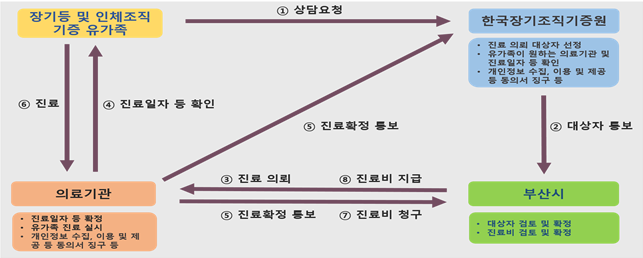 ▲시가 사업총괄 관리, 진료비 지원을 하며, ▲한국장기조직기증원이 장기기증자 유가족 관리, 진료대상자 신청접수, 진료 의뢰 등을 한다.