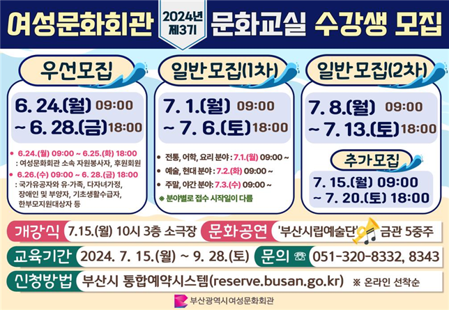 [로컬세계 부산=김의준 기자]부산시 여성문화회관은 시민들에게 전문적인 능력개발 및 삶의 질 향상을 위한 폭넓은 기회를 제공하고자 「2024년 제3기 문화교실」 수강생을 오는 24일부터 모집한다고 21일 밝혔다.