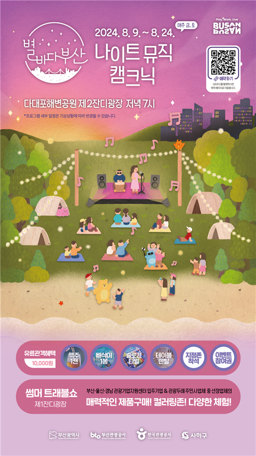 [로컬세계 부산=맹화찬 기자]부산시는 한국관광공사 부산관광공사와 함께 다대포 해변공원에서 '2024 별바다부산 나이트 뮤직 캠크닉'을 개최한다고 7일 밝혔다.