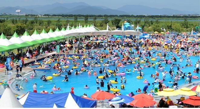 | ▲부산 삼락생태공원 야외수영장에서 시민들이 물놀이를 즐기고 있다. |