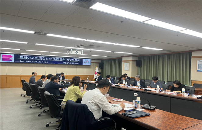 ▲ 부산시가 내년 6월까지 '글로벌 물류 허브도시' 도약을 위한 '트라이포트 혁신전략' 수립 용역을 추진키로 한 가운데 지난 23일 열린 용역 착수보고회 개최 장면. 부산시 제공 |