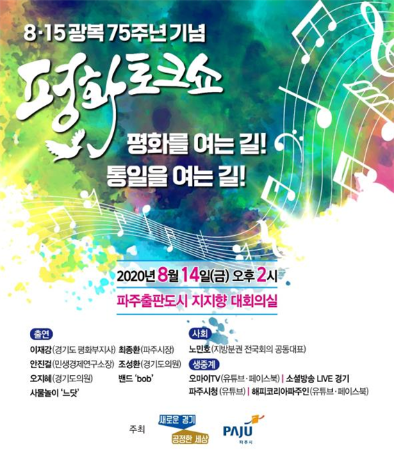 [로컬세계 이혁중 기자]경기도가 8.15 광복 75주년을 기념해 한반도 평화의 의미를 되새기고 미래를 전망해보는 ‘평화토크쇼’를 오는 14일 오후 2시 파주출판도시 지지향 대회의실에서 연다.