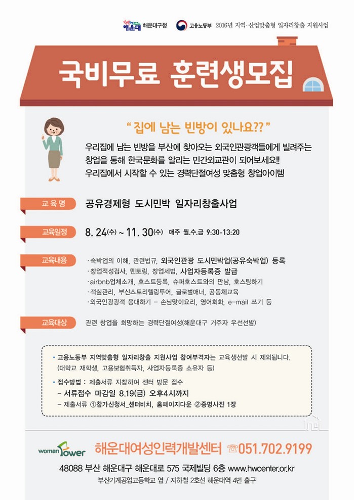 수강을 원하는 주민은 오는 8월 19일까지 해운대여성인력개발센터를 방문 접수하면 된다. 창업을 희망하는 경력단절여성 누구나 신청 가능하며 서류심사와 면접을 통해 24명을 선발한다.