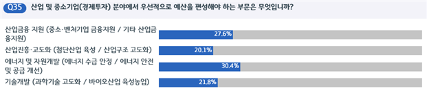 도민들은 경제투자 활성화를 위해 에너지 및 자원개발(에너지 수급안정/에너지 안전 및 공급 개선 등)을 최우선 과제로 선정했다(30.4%). 뒤이어, 중소·벤처기업 금융지원 등 산업금융 지원(27.6%), 과학기술 고도화 등 기술개발(21.8%), 첨단산업 육성 등 산업진흥 고도화(20.1%)를 각각 주문했다.
