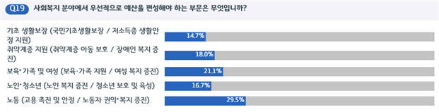 경제투자에 이어 관심이 집중된 사회복지분야의 활용처로는 29.9%가 고용 촉진·안정과 노동자 권익·복지 증진을, 20.8%가 보육·가족지원과 여성 복지 증진을, 18%가 취약계층 아동보호와 장애인 복지증진을 요청했다.