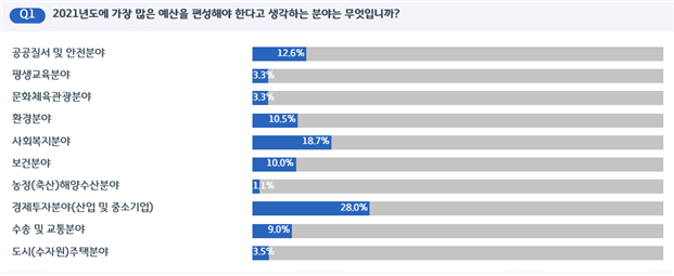 우선 ‘2021년도에 가장 많은 예산을 편성해야 한다고 생각하는 분야는 무엇입니까’라는 질문에 도민 28%가 ‘경제투자(산업 및 중소기업)’라고 응답했다. 이어 사회복지(18.7%), 공공질서 및 안전(12.6%), 환경(10.5%) 등의 순이었으며 가장 응답자가 적었던 분야는 농정해양(1.1%)이었다.