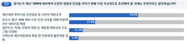 공공질서 및 안전분야와 관련해 경기도가 가장 우선적으로 추진해야 할 과제로는 59.4%가 취약시설 안전점검 및 사전적 예방조치를 선택해 반복되는 재난·재해와 안전 불감증에 대한 도민들의 우려를 여실히 나타냈다.