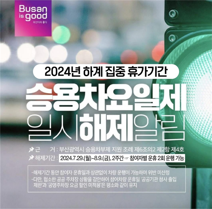 [로컬세계 부산=맹화찬 기자]부산시는 집중 하계휴가 기간, 승용차요일제 참여자의 편의 제공을 위해 29일부터 8월 9일까지 승용차요일제를 일시 해제한다고 밝혔다.