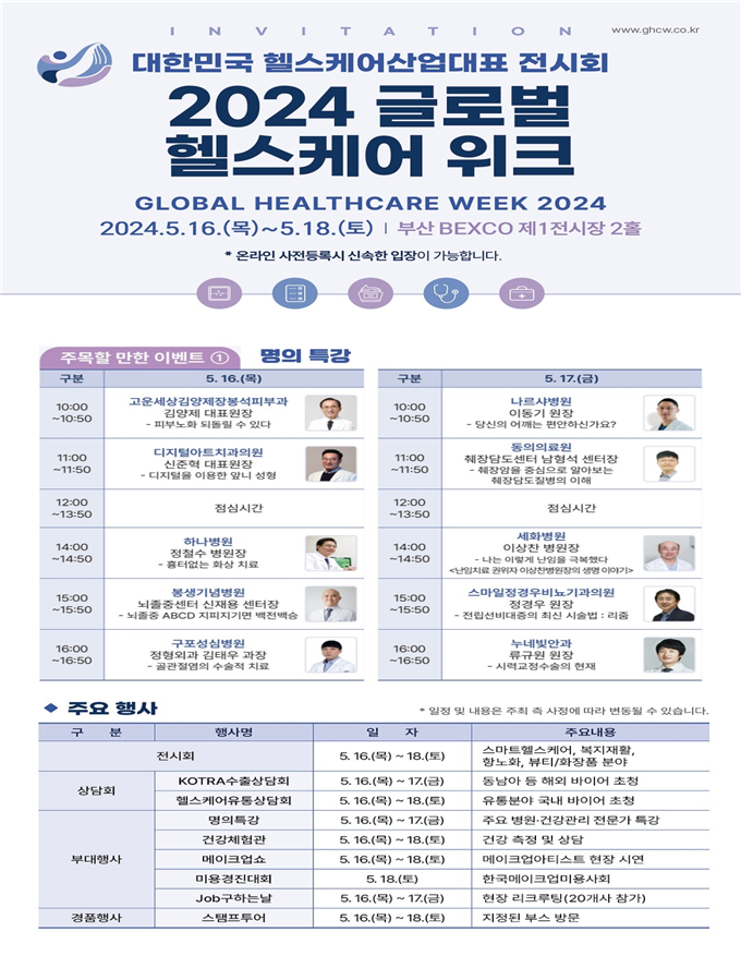 [로컬세계 부산=전상후 기자] 부산시는 16일부터 18일까지 벡스코 제1전시장에서 '2024 글로벌 헬스케어 위크'를 개최한다고 14일 밝혔다.