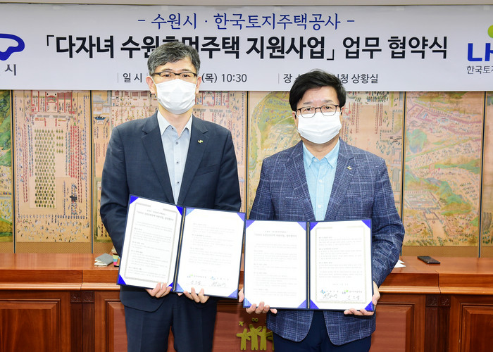 | ▲염태영 수원시장(오른쪽)과 김요섭 LH 경기지역본부장이 ‘다자녀가구 수원휴먼주택 지원을 위한 업무협약’ 체결 후 함께하고 있다. |