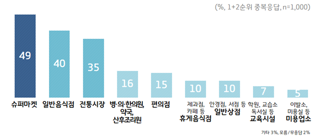 도민들은 ‘경기도 재난기본소득’을 지급받으면 ▲슈퍼마켓(49%) ▲일반음식점(40%) ▲전통시장(35%) 등에서 사용할 계획이라고 답했다. 그 다음으로 ▲병·의·한의원, 약국, 산후조리원(16%) ▲편의점(15%) 순으로 높았다.(1+2순위 중복응답)