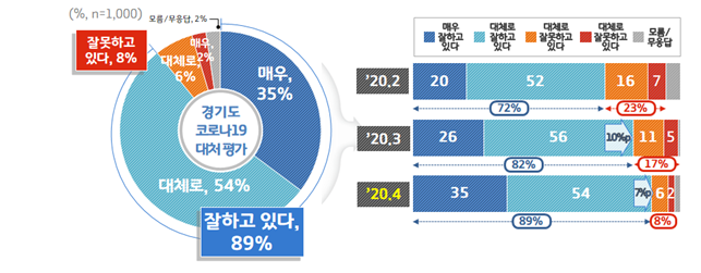 또한 코로나19에 대한 경기도 대처에 대해서는 89%의 도민이 ‘잘하고 있다’고 평가했다. 이는 2월 조사보다 17%p 상승한 수치다.