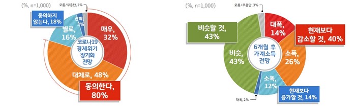도민 다수(80%)는 코로나19로 인해 국가경제가 위기에 빠지고 사태가 장기화될 것이라고 봤다. 실제 가계소득이 코로나19 발생 이전보다 감소했다는 응답이 58%에 달했고, 도민의 40%는 6개월 후 가계소득에 대해서도 현재보다 감소할 것이라고 전망했다.