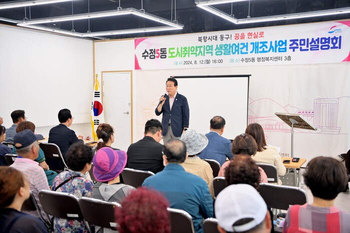 ▲ 김진홍 구청장이 '수정5동 도시 취약지역 생활여건 개조사업' 주민설명회를 진행하고 있다. 동구청 제공 |